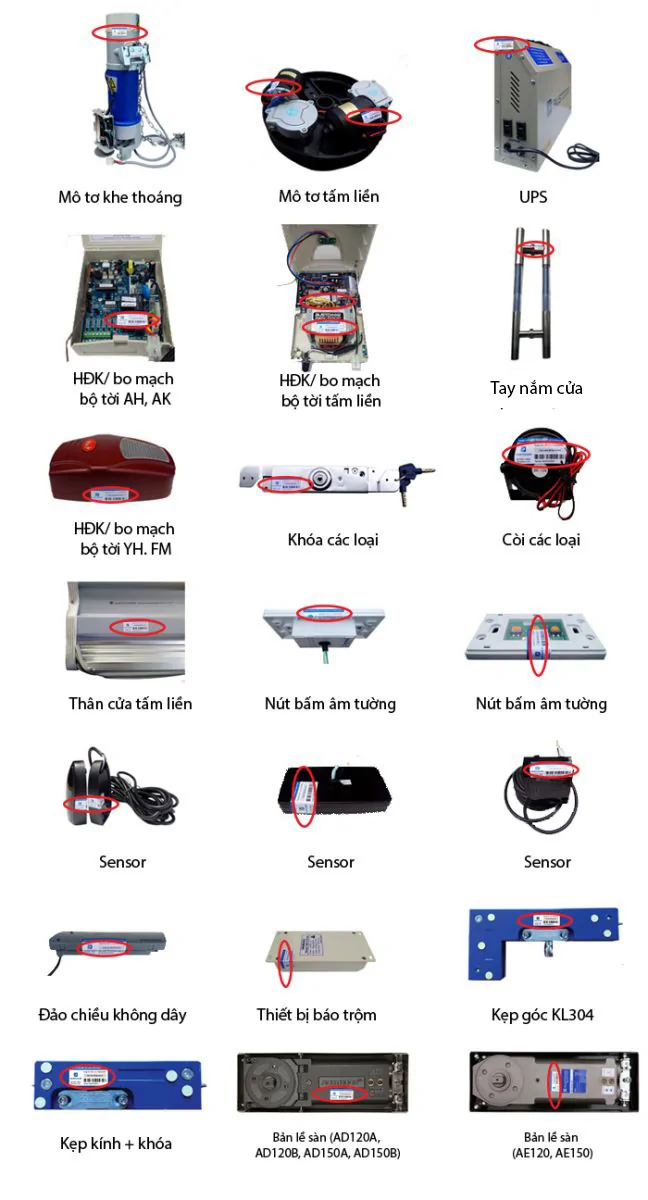 Minh họa vị trí dán tem bảo hành trên các vị trí sản phẩm: